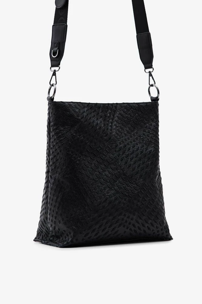Yksinkertaisen tyylikäs laukku, jossa on pientä brodeerauskuviointia pinnassa ja Desigual-logo etupuolella.