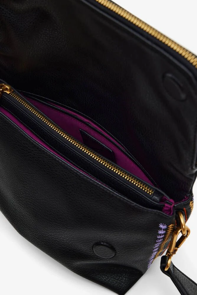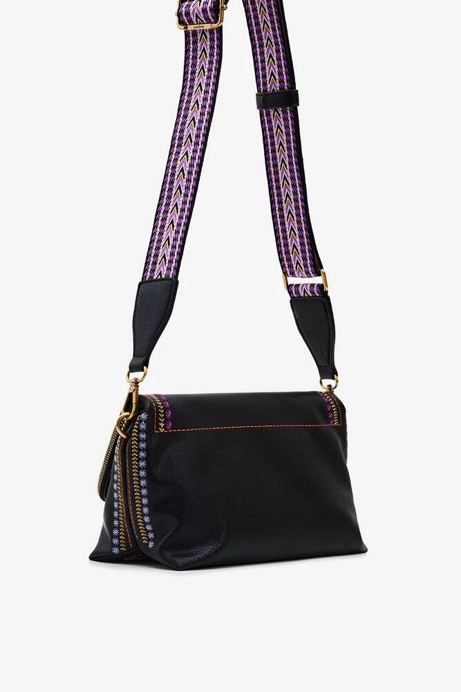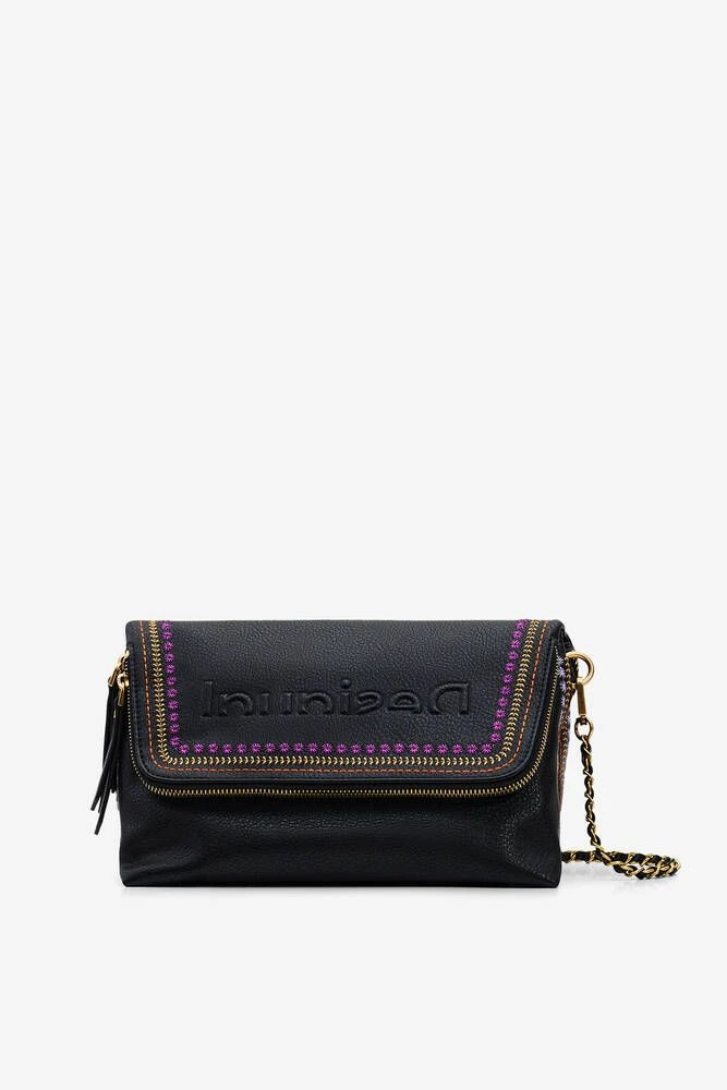 Desigual laukku taitettavalla läpällä ja vetkoketjulla. Laukkussa on metallinen ketjuhihna sekä leveä ja säädettävä printtikangashihna.