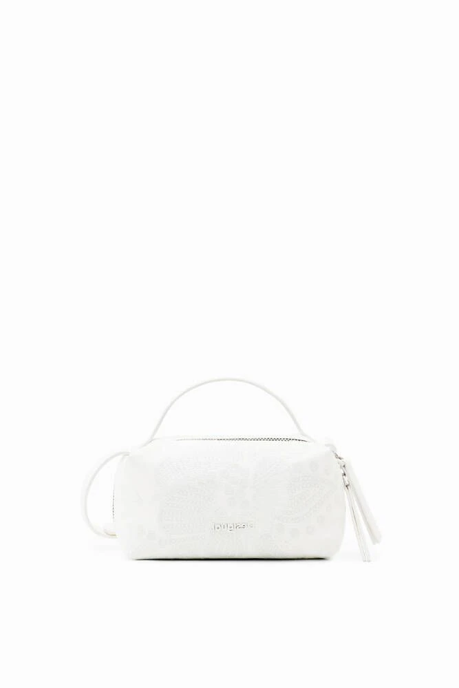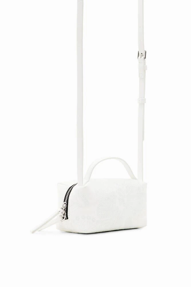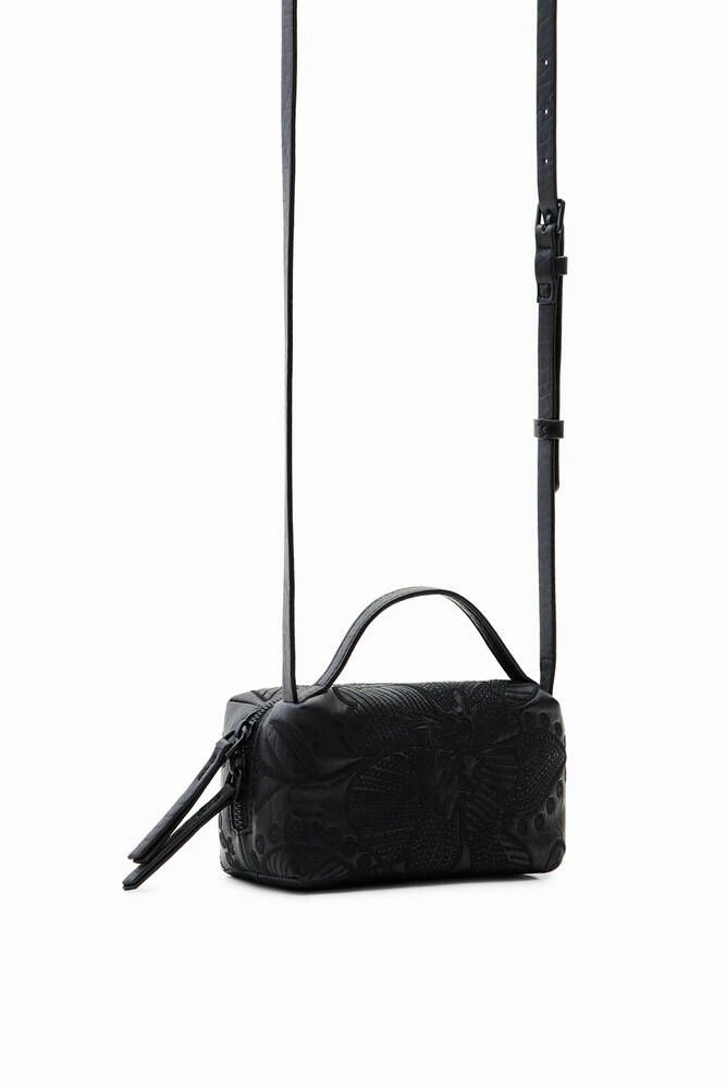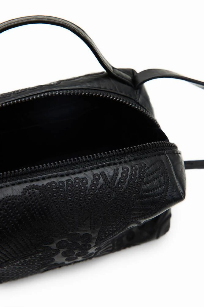 Pieni crossbody-laukku keinonahasta, jossa on kukkakirjontaa ja kaksi kahvaa.