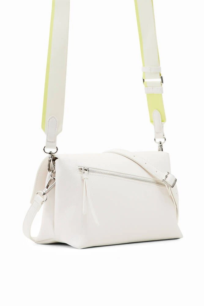 Crossbody-laukku nahkavaikutteisesta kankaasta, jossa on kohokuvioitu puolilogo, läppä sekä useita lokeroita ja taskuja.