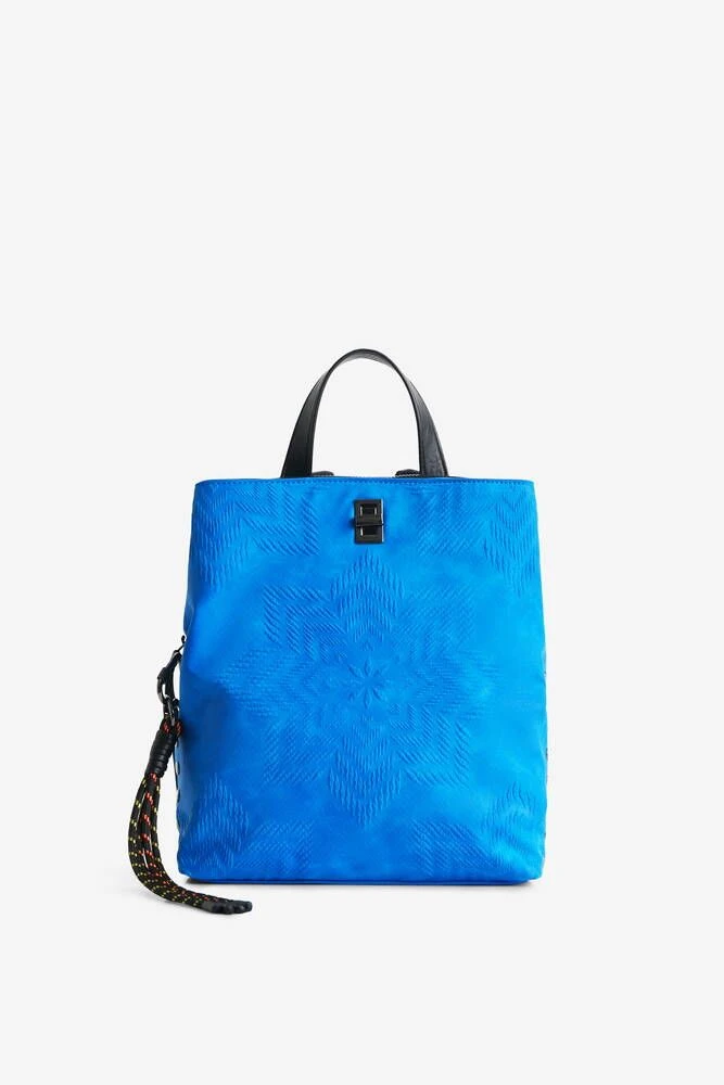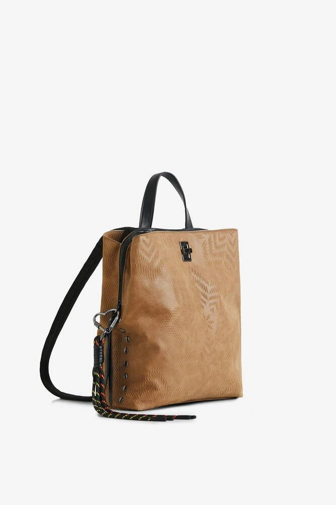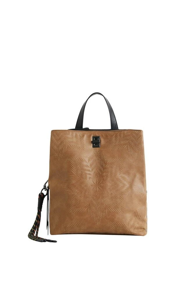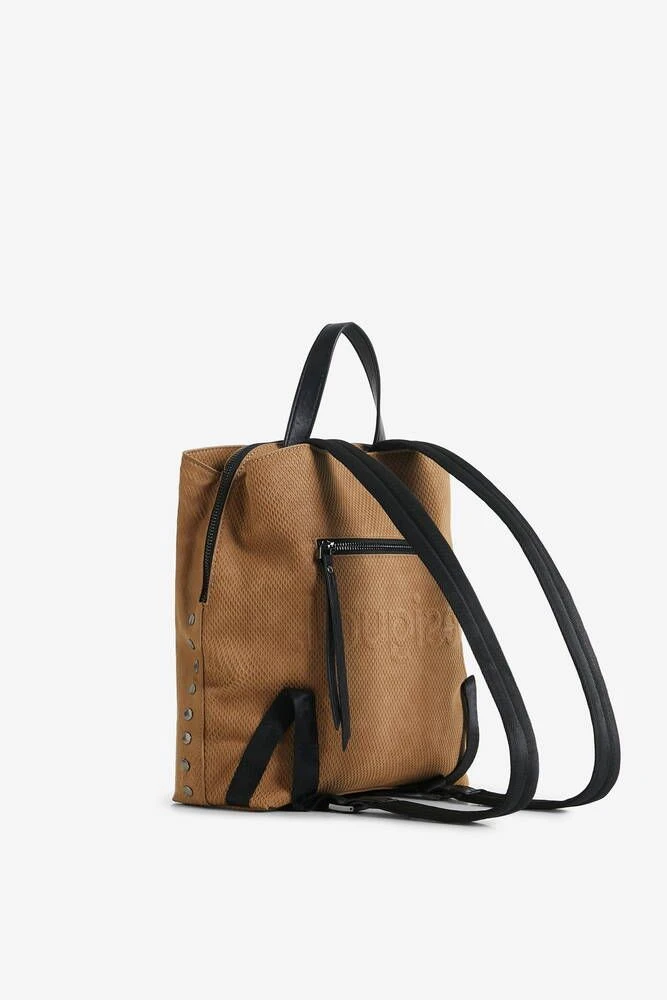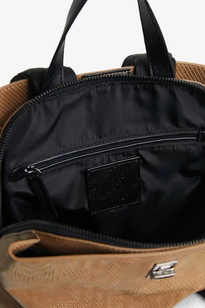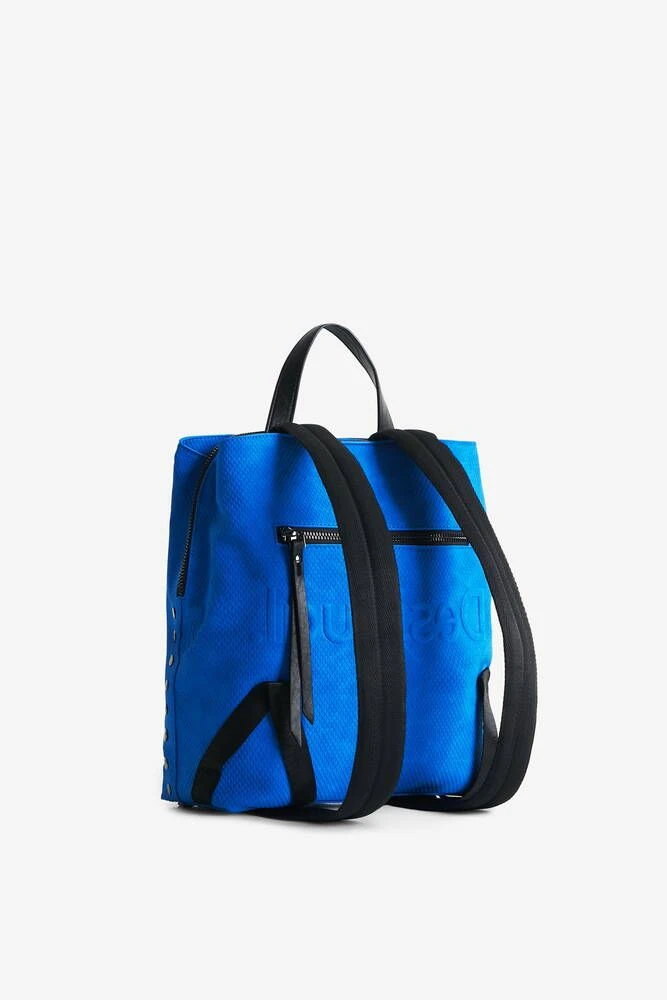 Yksivärinen reppu hillityllä kuvioinnilla. Repussa on takapuolella Desigual-logo. Repun etupuolella on iso tasku klipsi kiinnityksellä.
