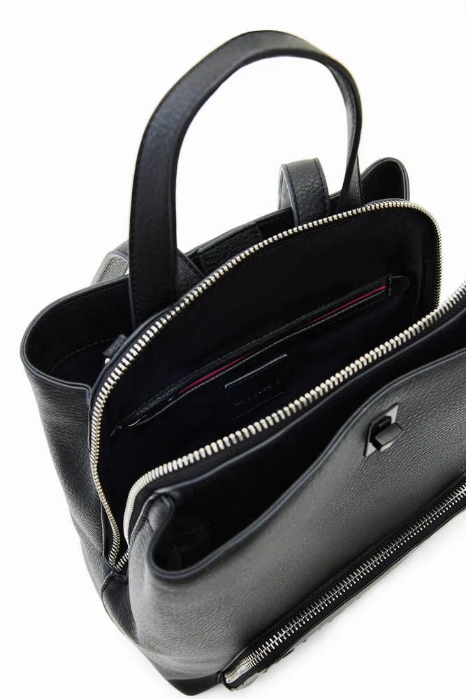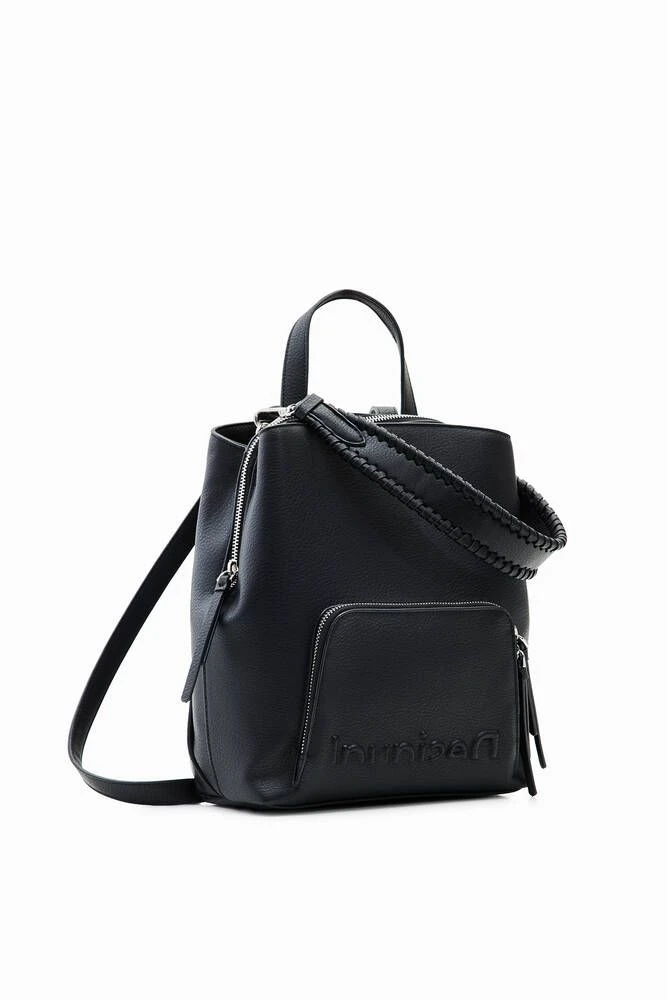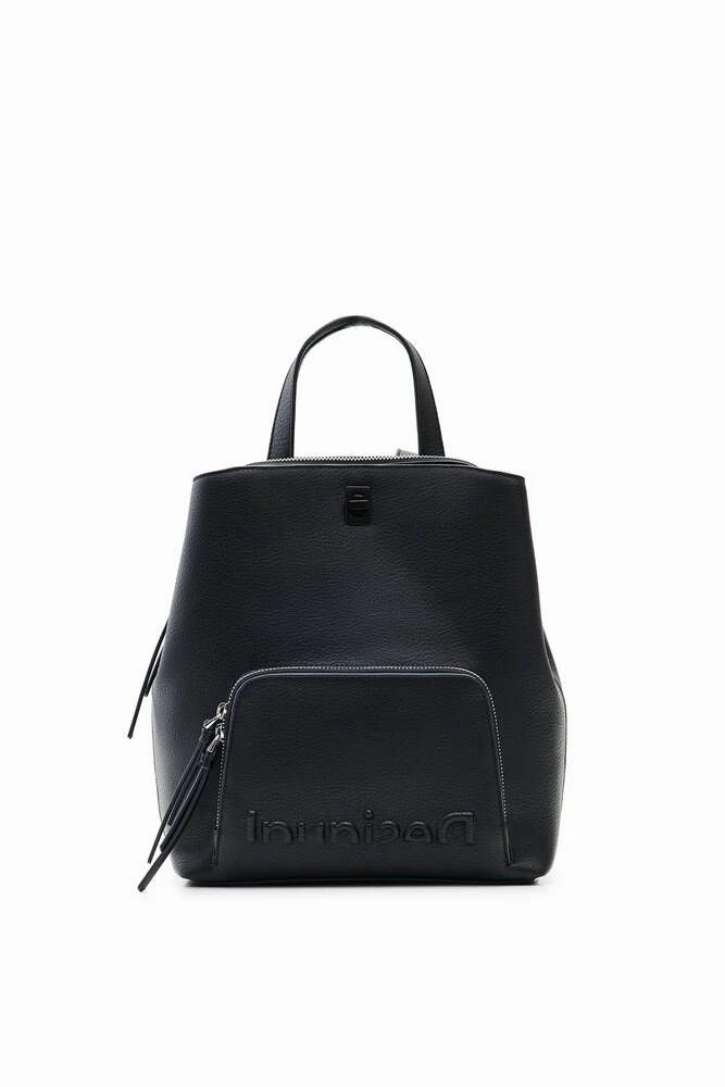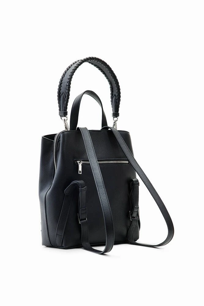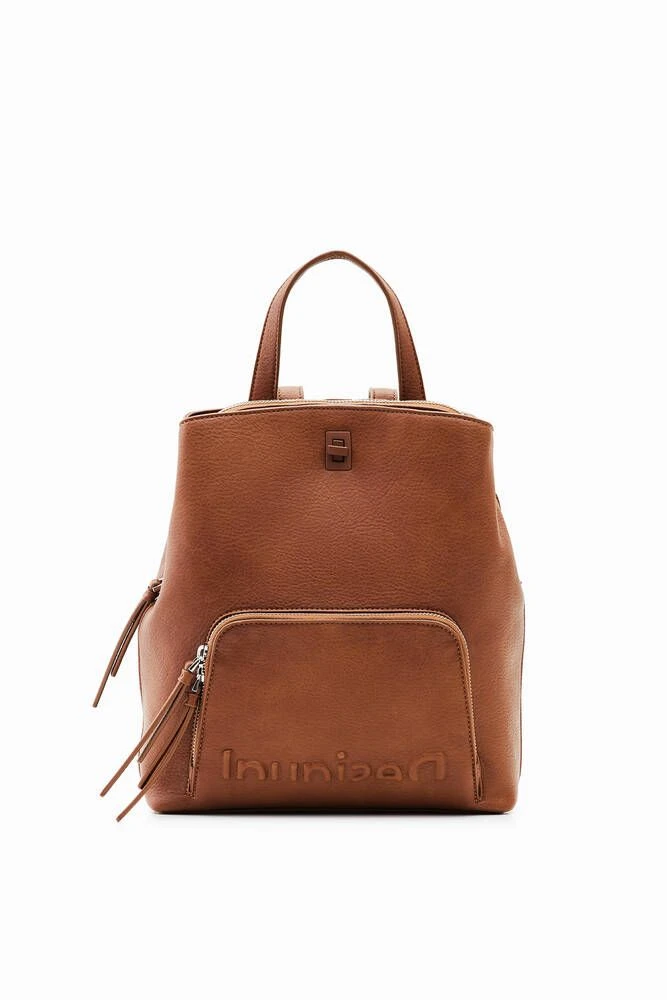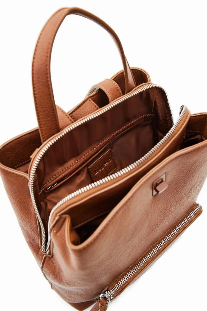 Pieni reppu nahkavaikutteisesta kankaasta, jossa on useita lokeroita ja taskuja.
