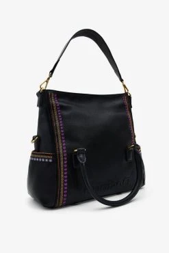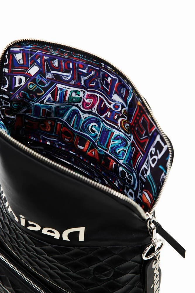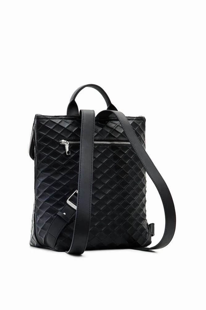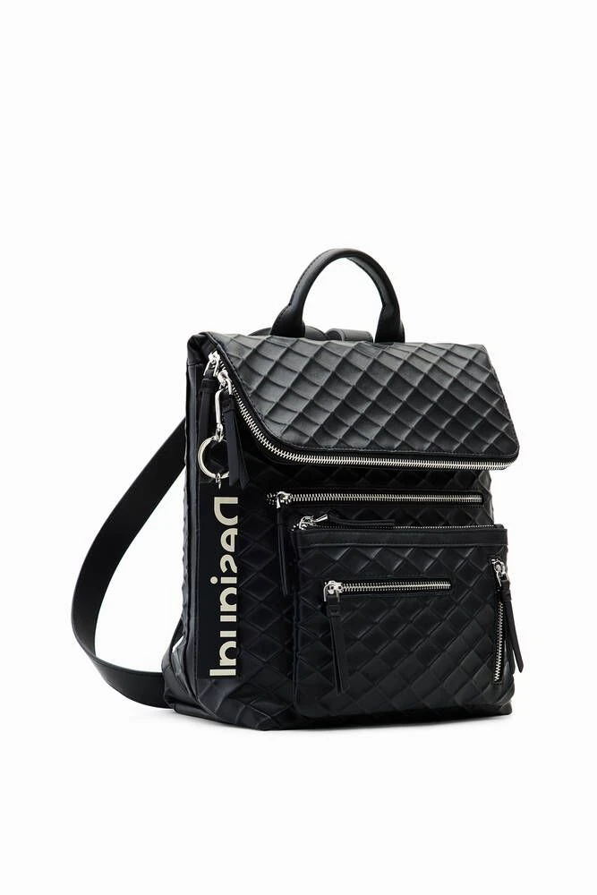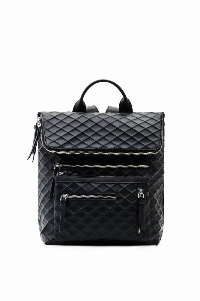 Keskikokoinen reppu timanttikuvinoinnilla, vetoketjullisella läpällä ja useilla taskuilla.
