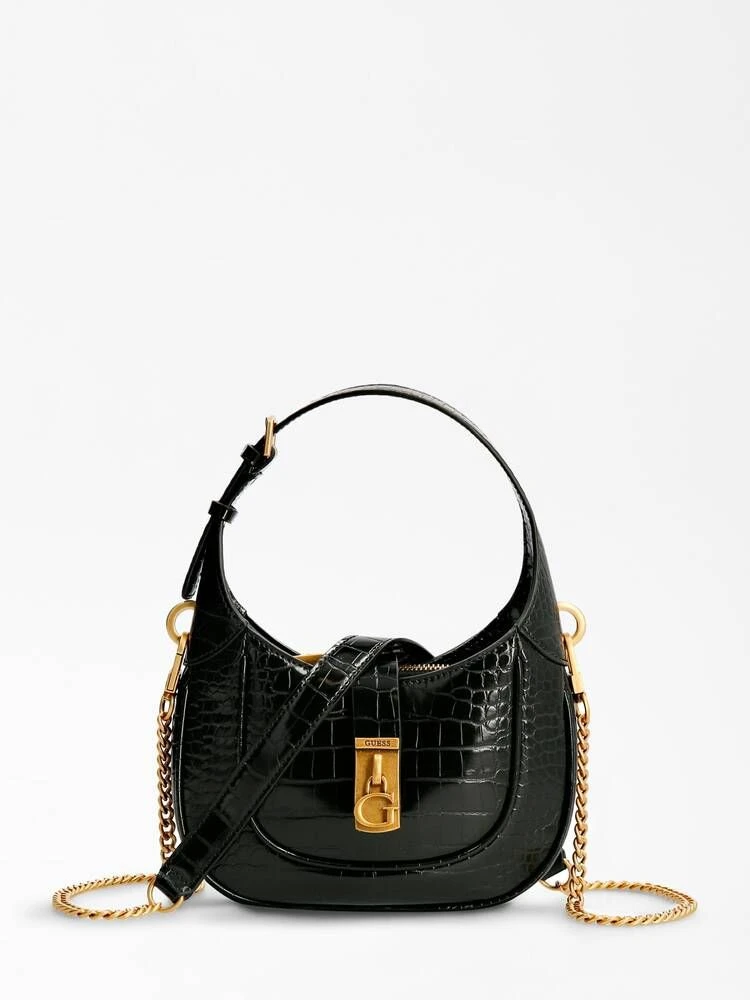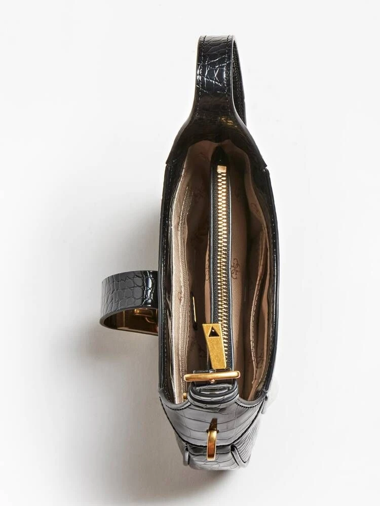 Upealla liskokuosilla koristeltu kiiltäväpintainen laukku vetoketju- ja solkikiinnityksellä.