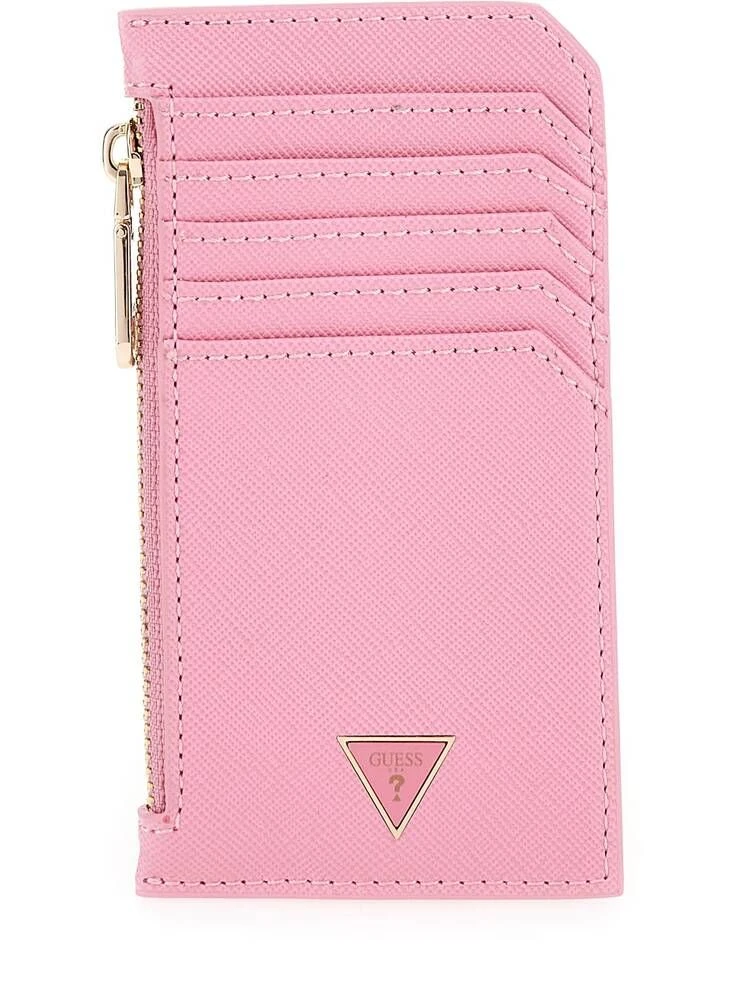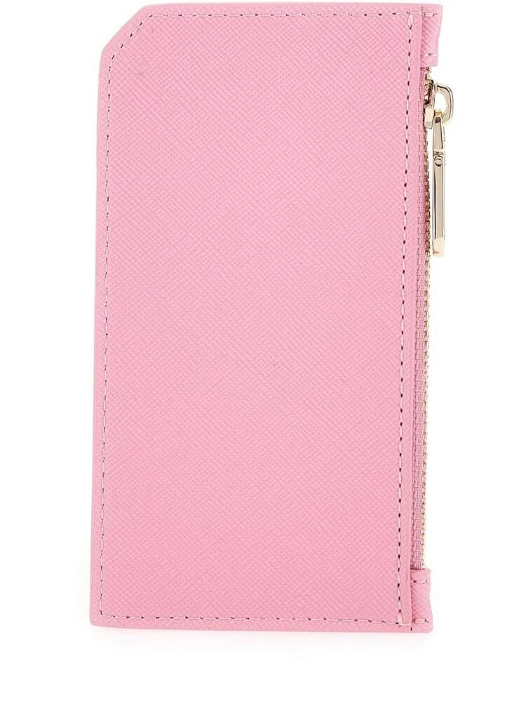 Vaaleanpunainen pieni korttikotelo tärkeimmille korteille. Kotelossa on korttipaikkojen lisäksi vetoketjullinen tasku.