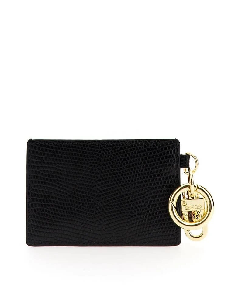 Vaakamallinen korttikotelo pienellä avainlenkillä ja roikkuvilla koristeilla.