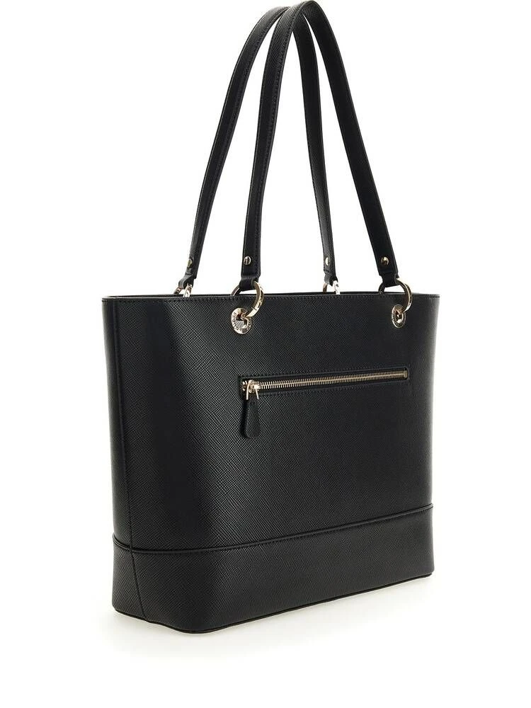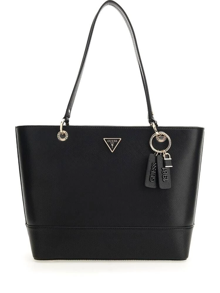 Struktuuripintainen kokomusta laukku etupuolen tyylikkäällä kolmiologolla. Tilavassa laukussa on kätevä vetoketjukiinnitys sekä edessä käsikahvoista riippuvat koristeet.