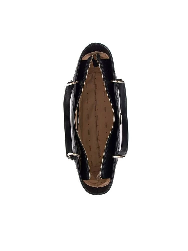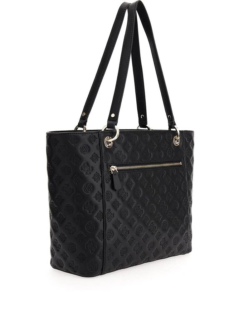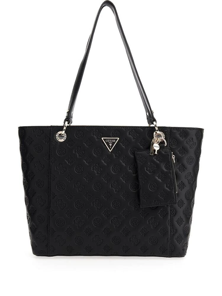 Tyylikäs musta laukku pionilogokuvioidulla painopinnalla ja pitkillä käsikahvoilla. Etupuolella on pieni Guess-kolmiologo. Mukana tulee pieni vetoketjullinen pussukka.