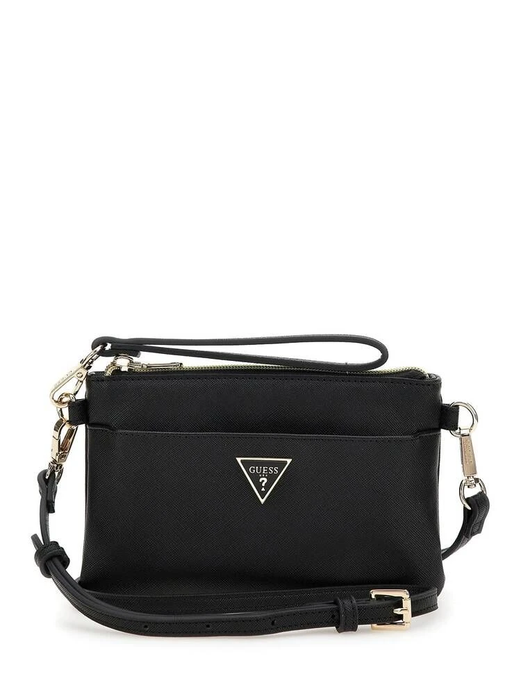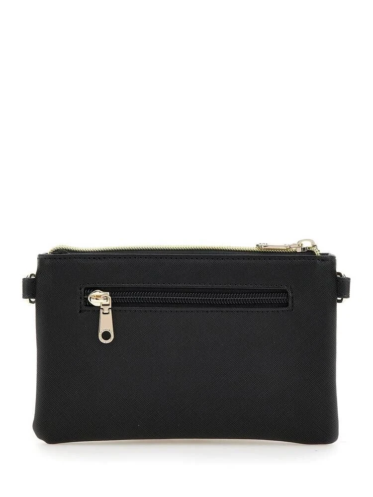 Ajaton musta pikkulaukku irrotettavalla olkahihnalla ja rannelenkillä. Edessä on tyylikäs Guess-kolmiologo. Laukun sisällä on pieni pussukka.