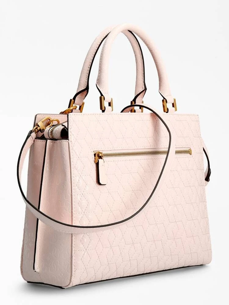 Naisten tyylikäs Guess laukku kiiltävällä logo kuvioidulla pinnalla.