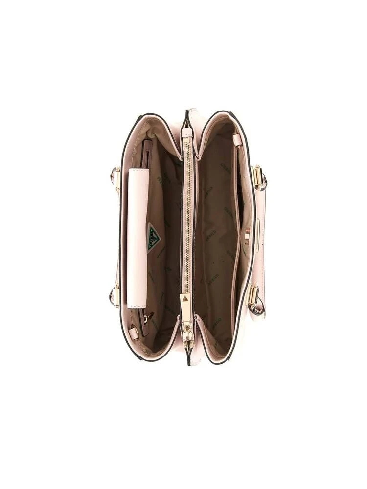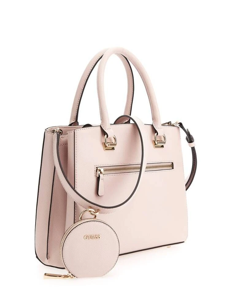Hempeä struktuuripintainen laukku tukevilla kantokahvoilla ja irrotettavalla olkahihnalla. Laukku on jaettu sisältä kolmeen osaan ja etupuolella on kiiltävä Guess-kolmiologo. Mukana tulee pieni vetoketjullinen pussukka.