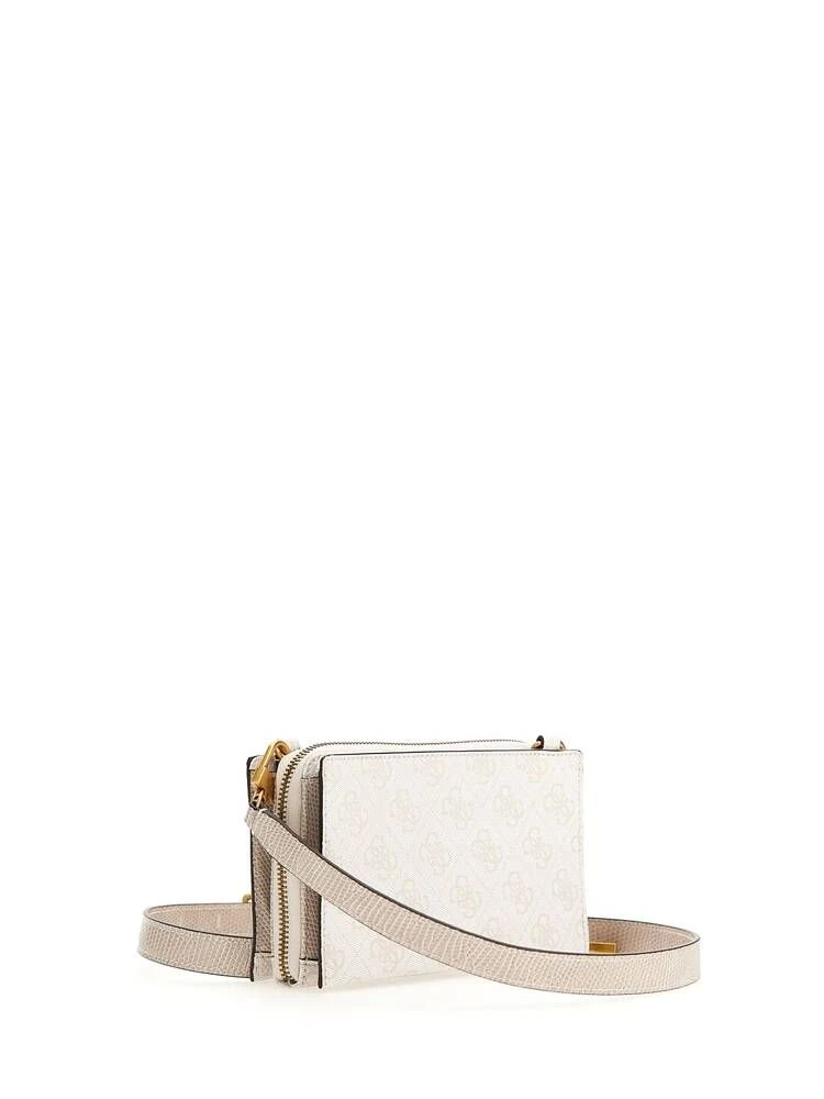 4G-logopintainen laukku, jonka etupuolella on tyylikäs Guess-metallikirjainlogo sekä roikkuva G-kirjain. Laukku on jaettu yhteen vetoketjulliseen sekä kahteen painonapilliseen osaan.