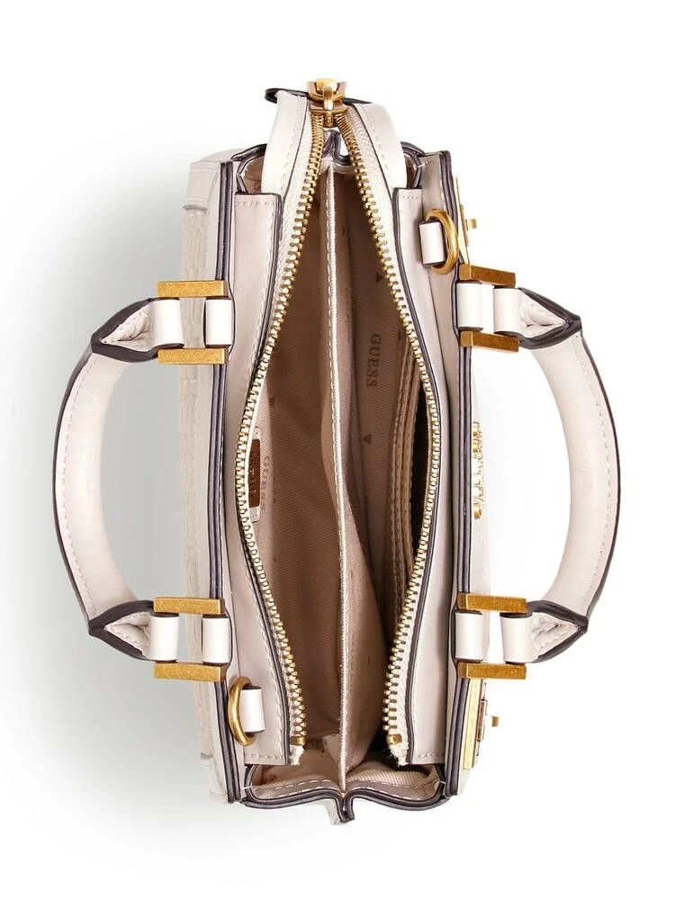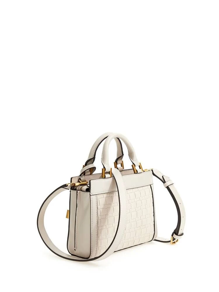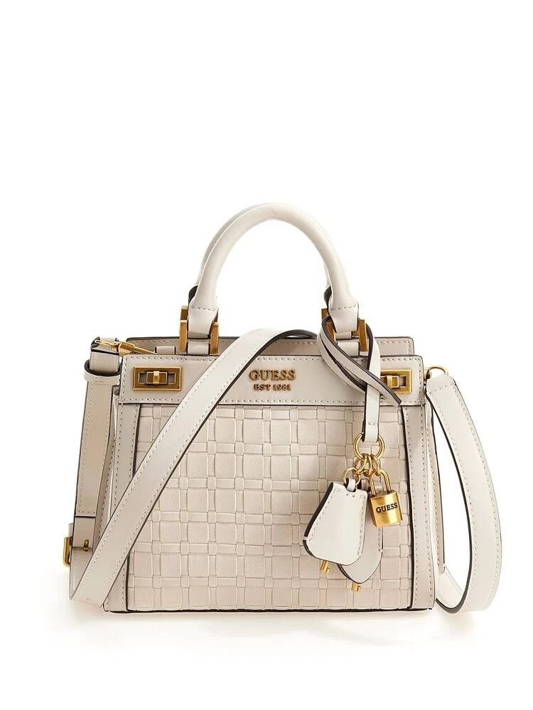 Naisten vaalea laukku, jossa on punottu päällinen. Laukussa on edessä Guess-tekstilogo sekä roikkuvat koristeet.