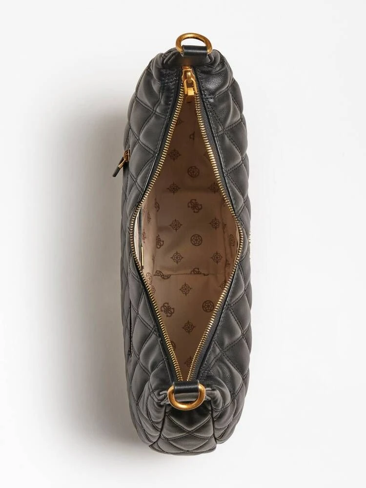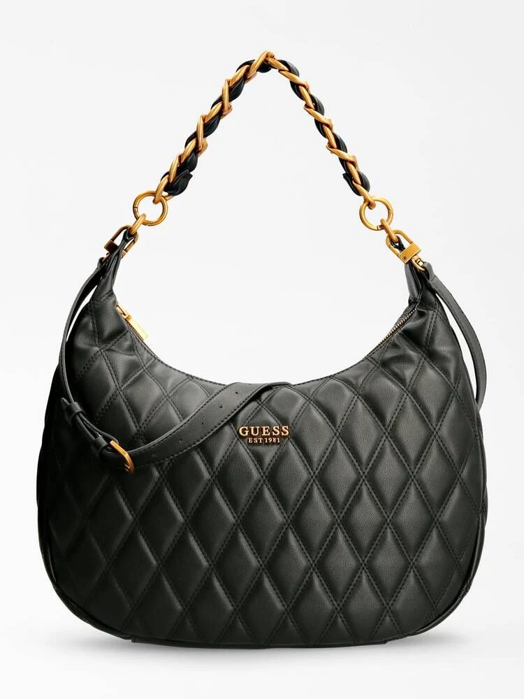 Tyylikäs Guess -laukku tikatullapinnalla. Laukussa on lyhyempi ketjuhihna ja pidempi säädettävä olkahihna.