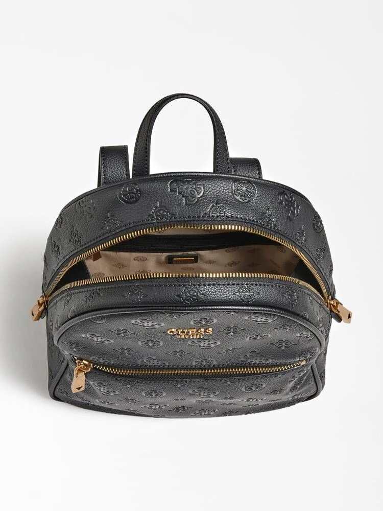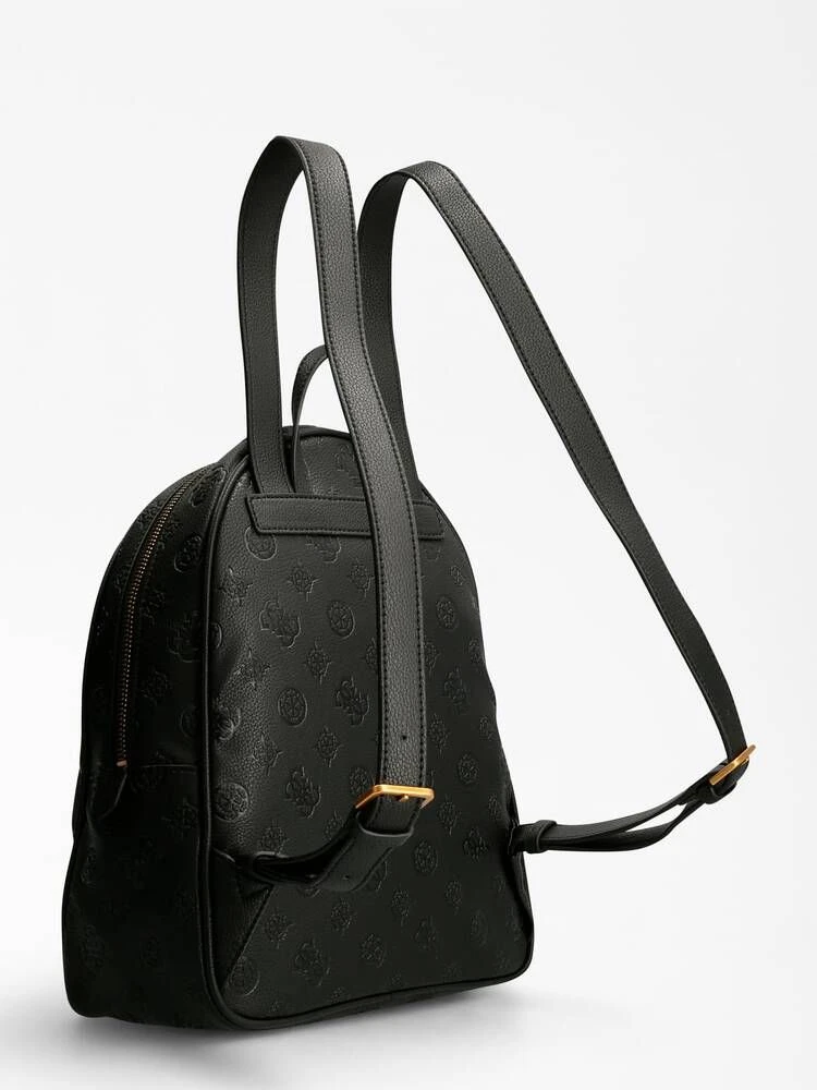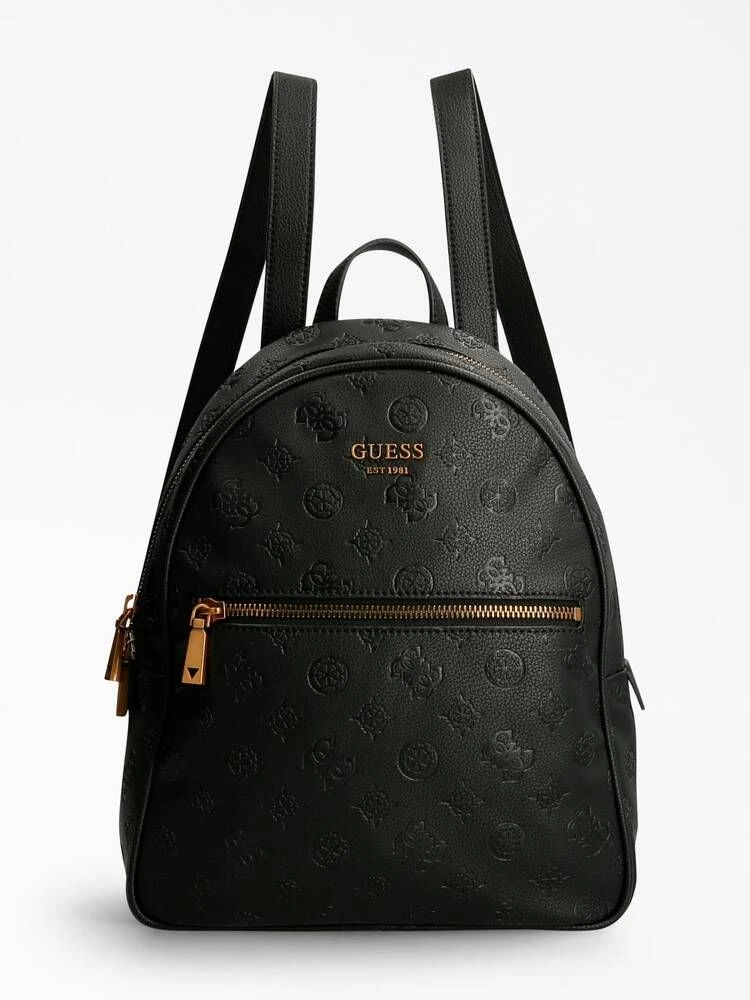 Tyylikäs Guess -reppu logokuvioidulla pinnalla. Säädettävät olkahihnat ja vetoketjulliset taskut.