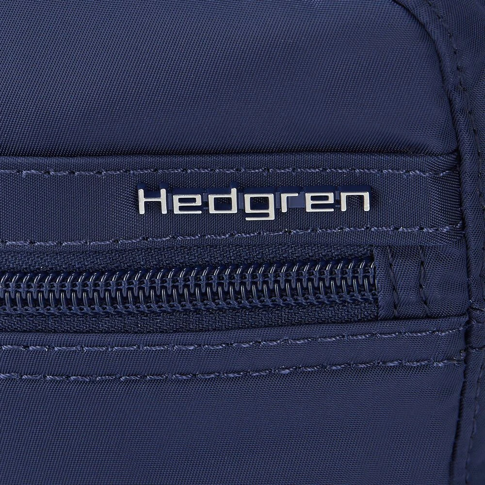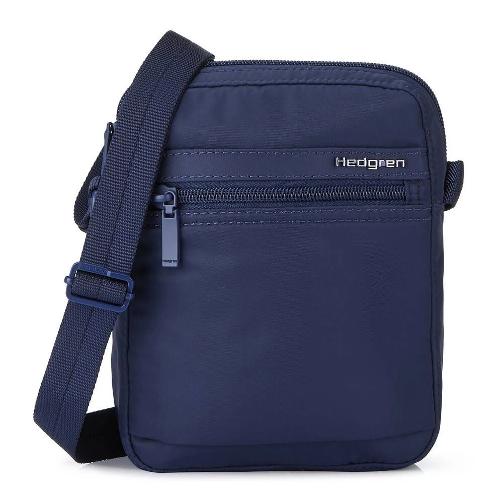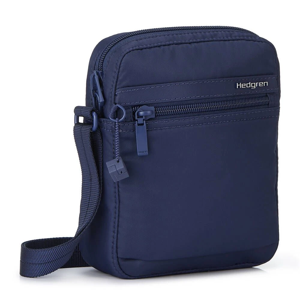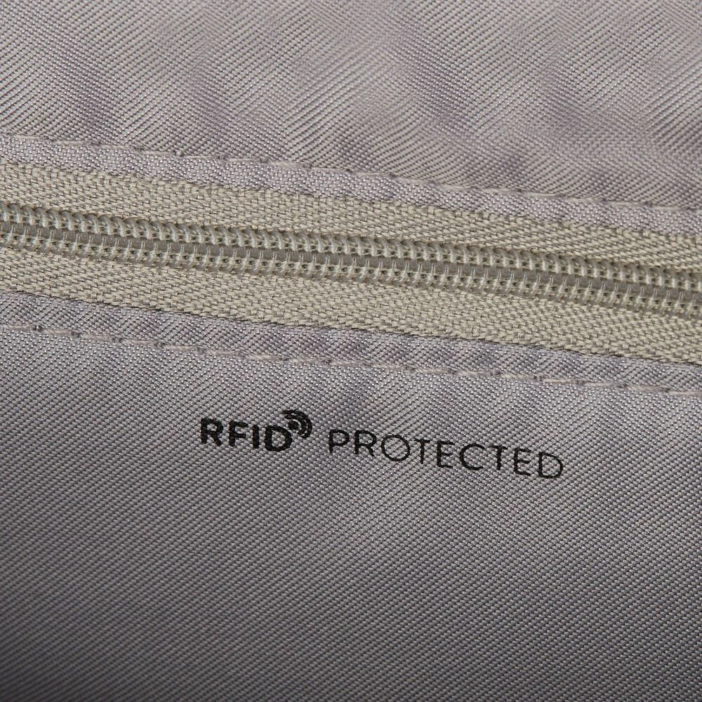Pieni ja kevyt RFID-suojattu olkalaukku. Laukussa on vetoketjutaskut edessä ja takana.