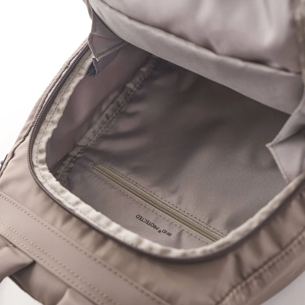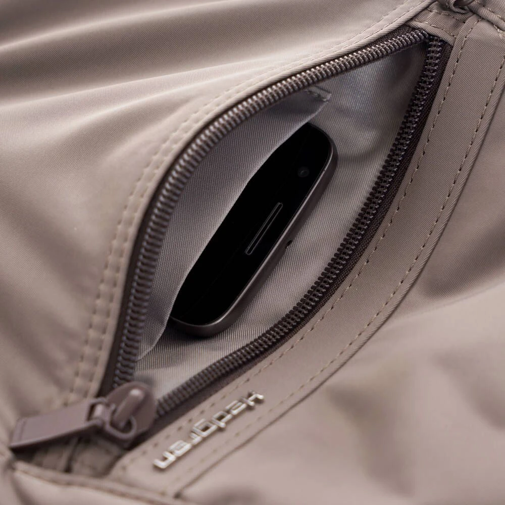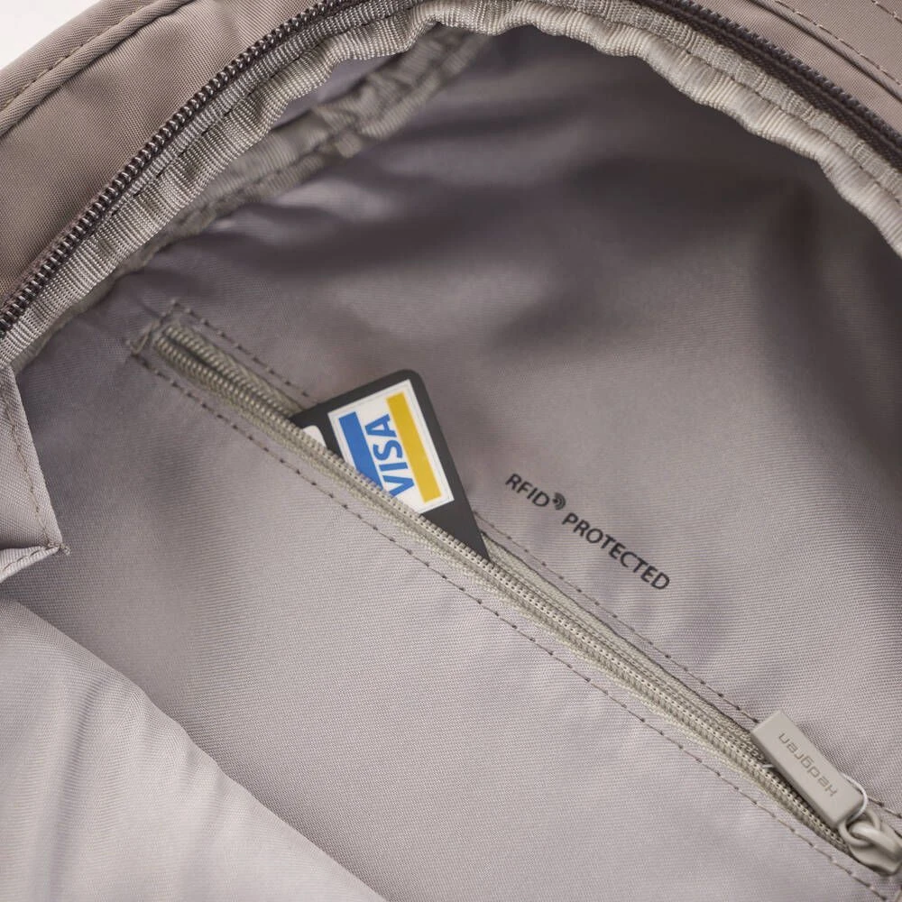 Kevyt, pieni ja turvallinen city-reppu. Pääosaston vetoketju on selän puolella, joten kukaan ei voi avata sitä huomaamattasi. Sisällä RFID-suojattu tasku sekä pehmustettu paikka minitabletille.