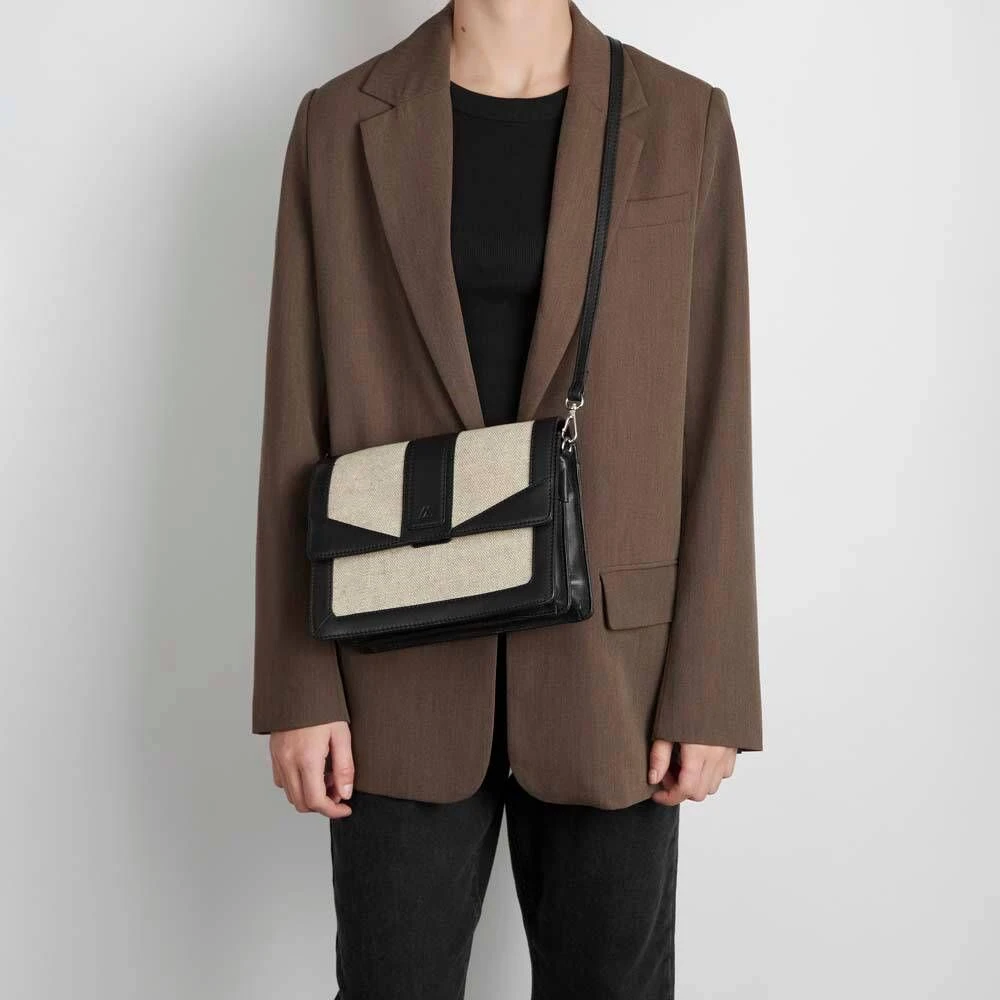 Tyylikäs crossbody-laukku hienoilla yksityiskohdilla. Laukussa on yhteensä viisi taskua ja lokeroa.