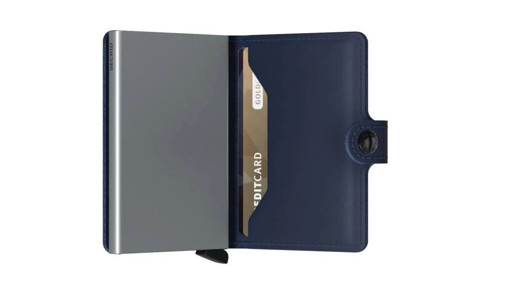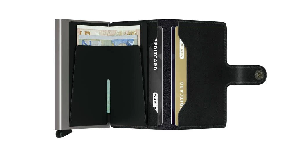 Miniwallet-lompakossa on sisällä Cardprotector-korttikotelo, johon mahtuu 8-10 korttia korttien paksuudesta riippuen. Kortit liukuvat tyylikkäästi kotelosta ulos vivusta painamalla. Laadukas kotelo estää tahattoman RFID/NFC -skannauksen. Kotelon ympärillä olevassa nahkaisessa osiossa on tilaa sekä korteille että seteleille. Jokaisessa Secrid-lompakossa on sarjanumero, joka takaa tuotteen aitouden.