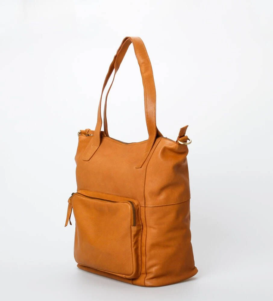 Nahkapintainen olkalaukku käsikahvoilla sekä säädettävällä ja irrotettavalla olkahihnalla.