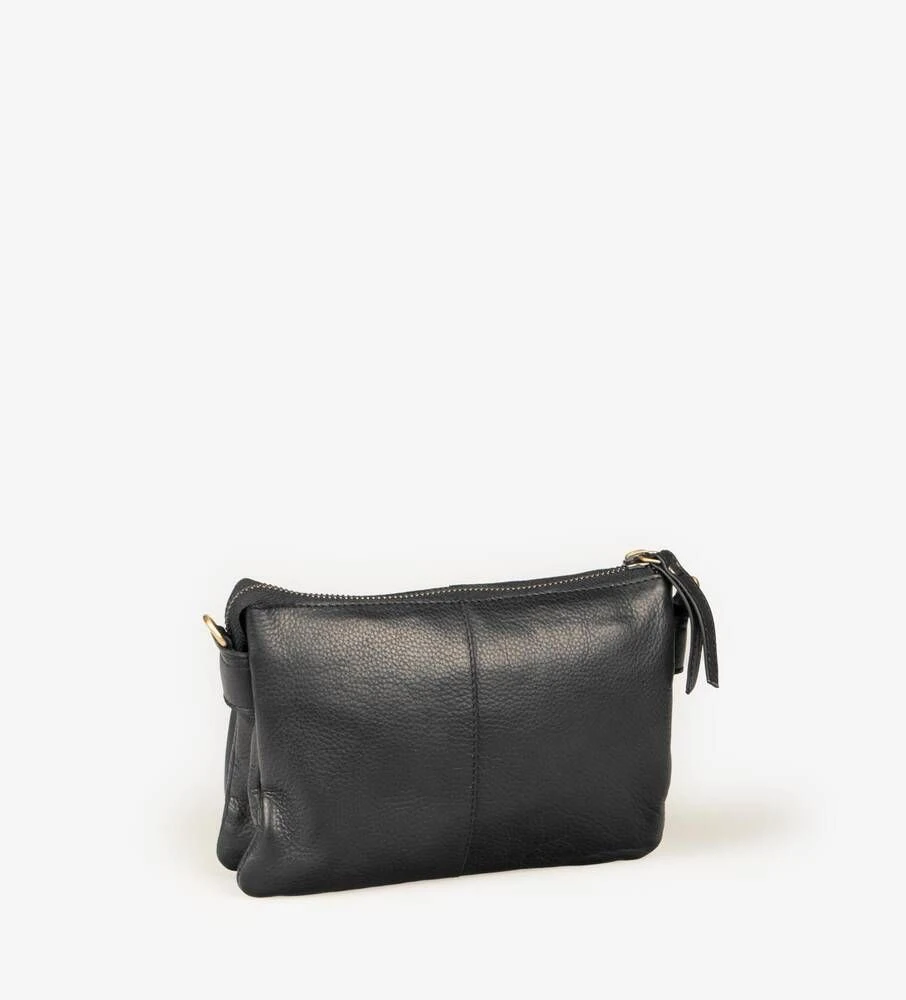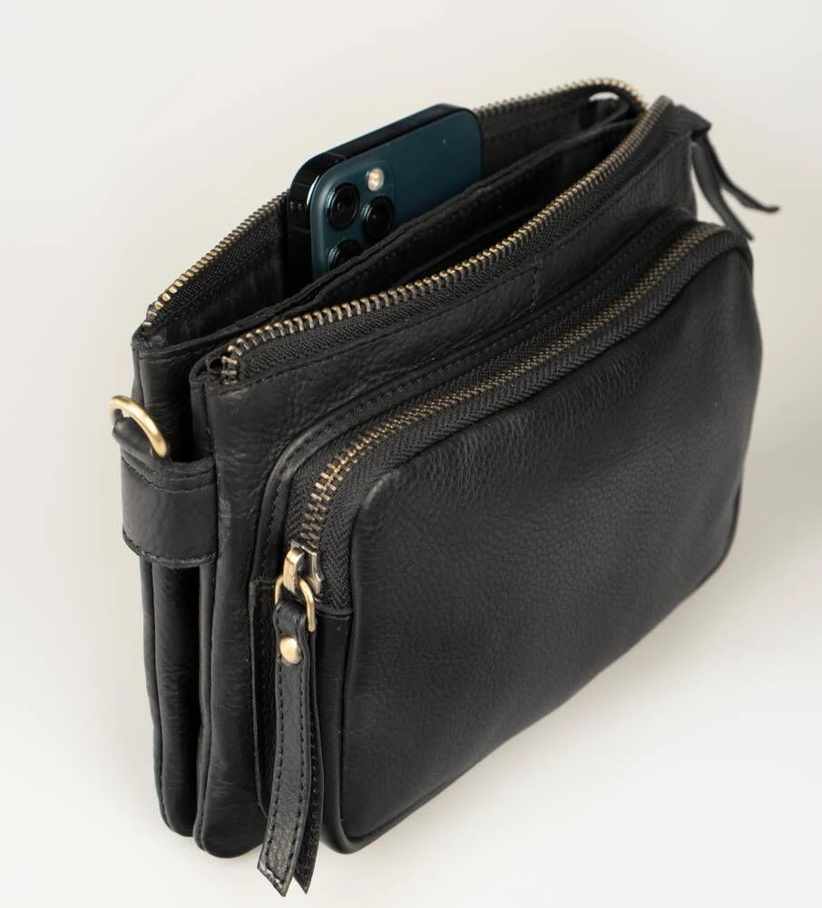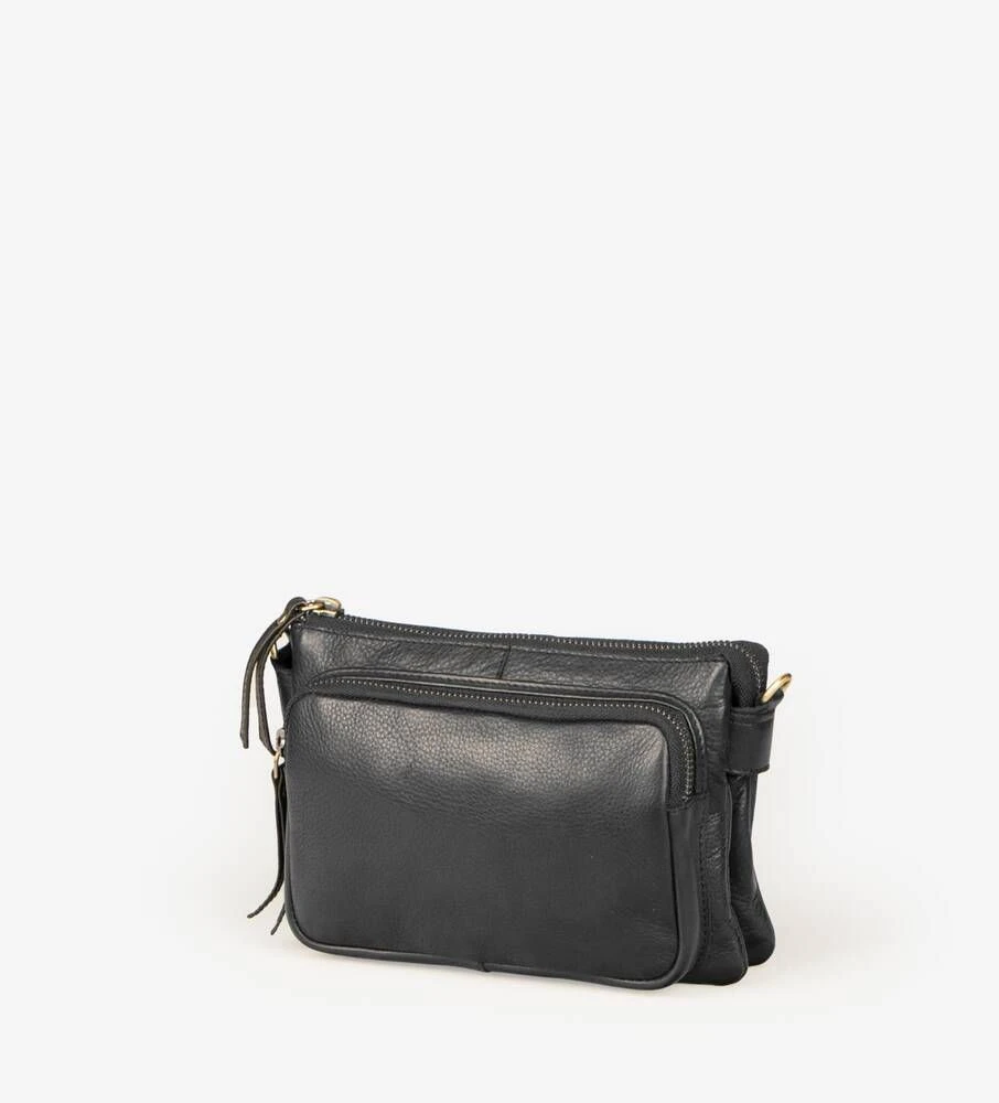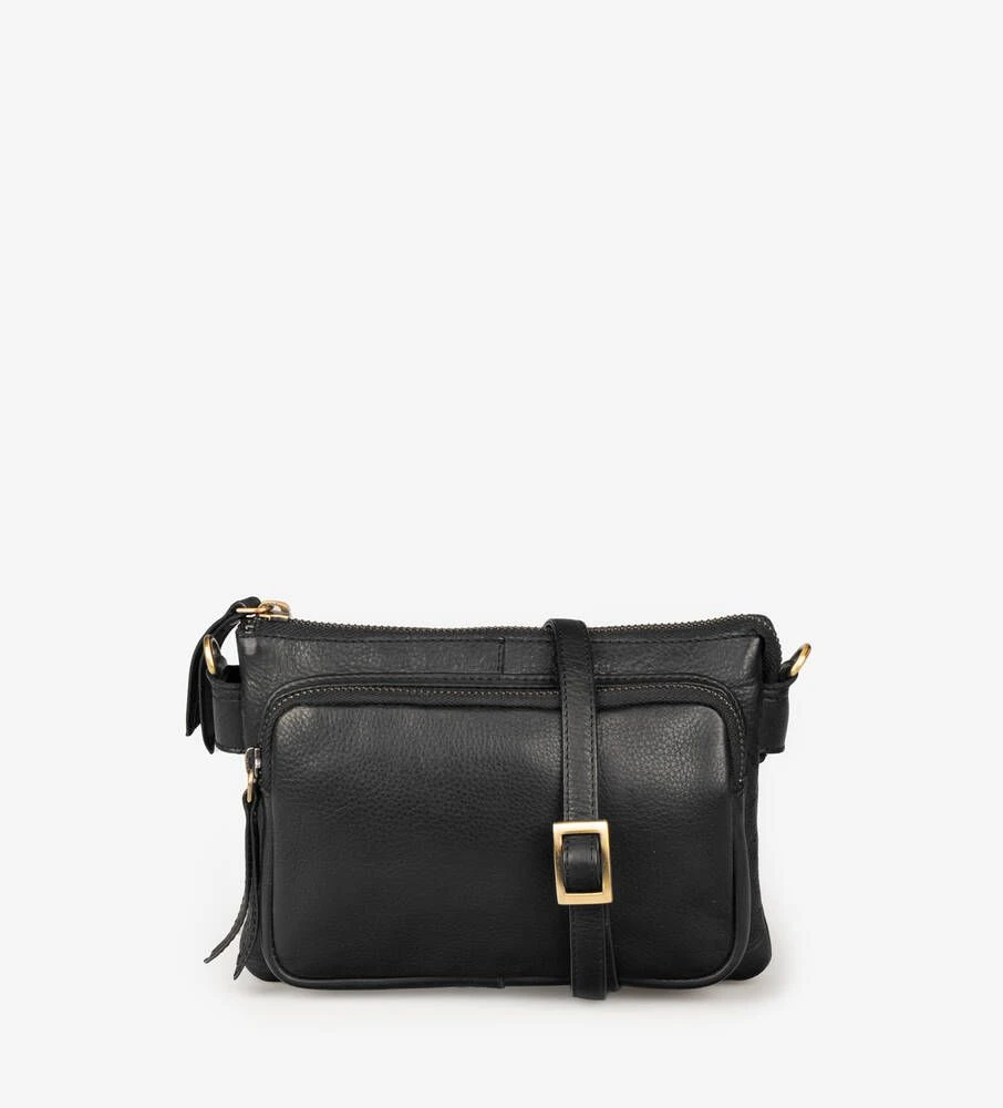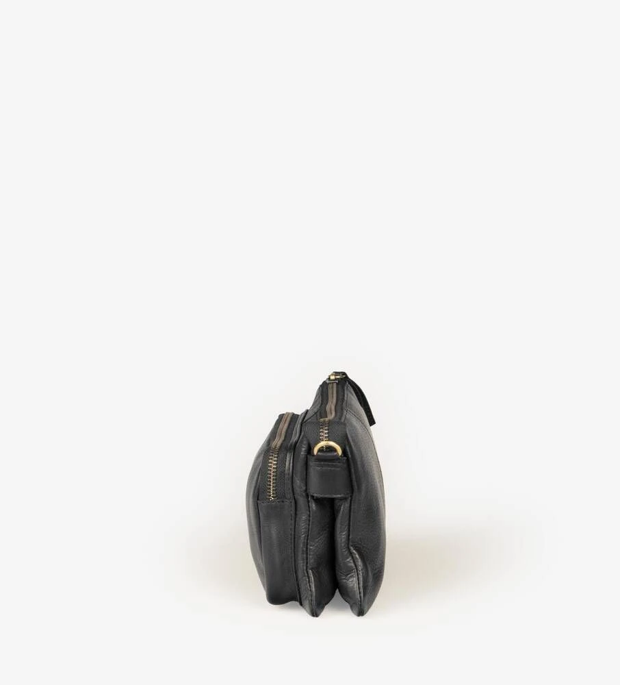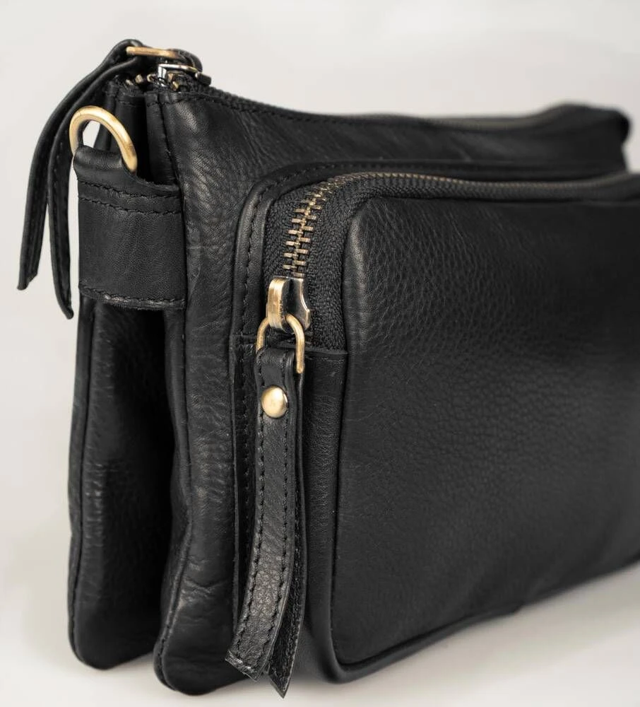 Nahkapintainen laukku säädettävällä olkahihnalla.