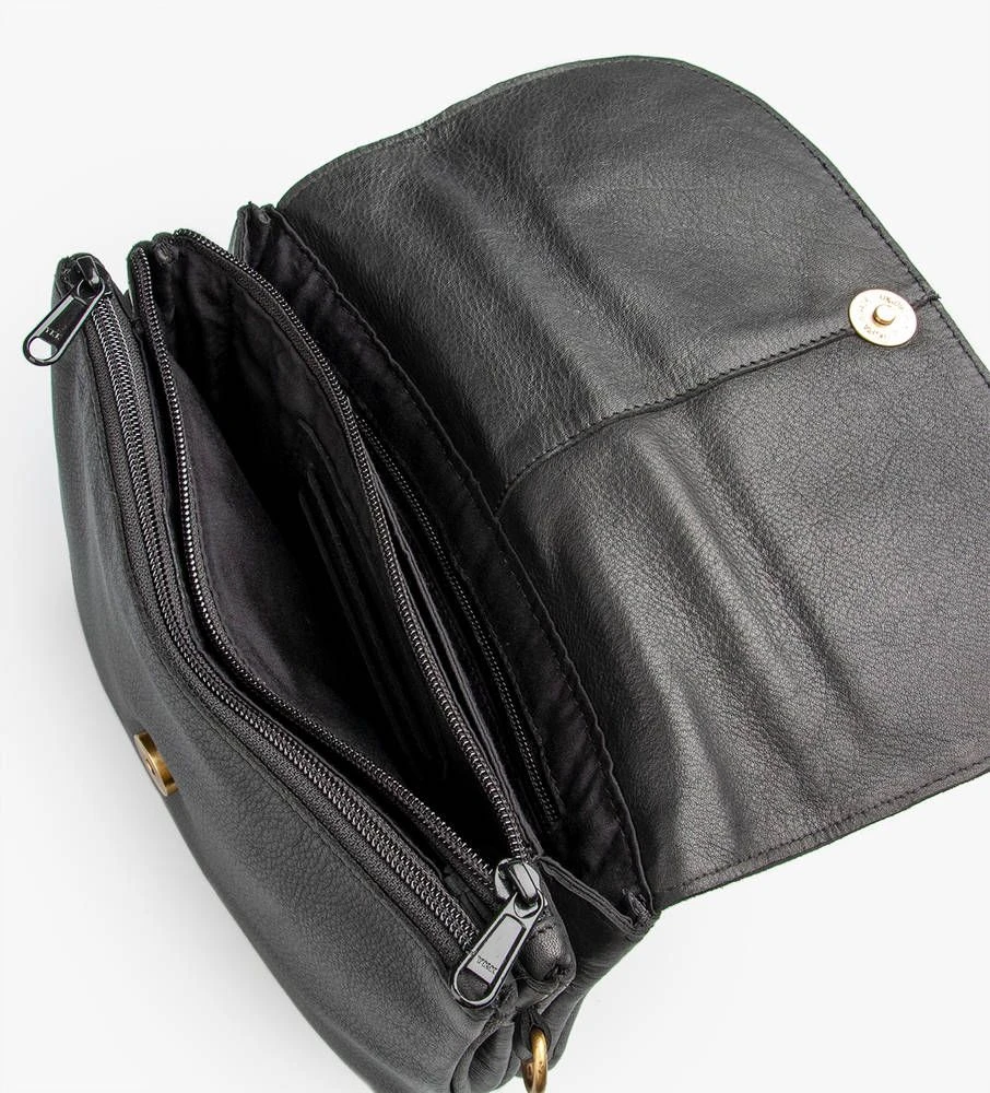 Tyylikäs nahkalaukku, jossa on monipuolisesta taskuja.