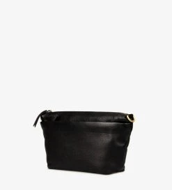 Pintanahkainen toiletlaukku ryppyisellä päällisellä ja vetoketjukiinnityksellä.